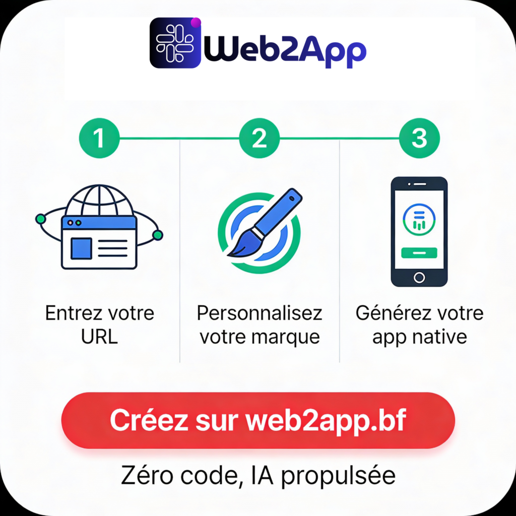 Web2App (https://web2app.bf), c’est cette petite révolution tranquille qui vous permet de rester connecté, visible et pertinent. Sans prise de tête. Parce qu’au fond, c’est ça, le vrai progrès.